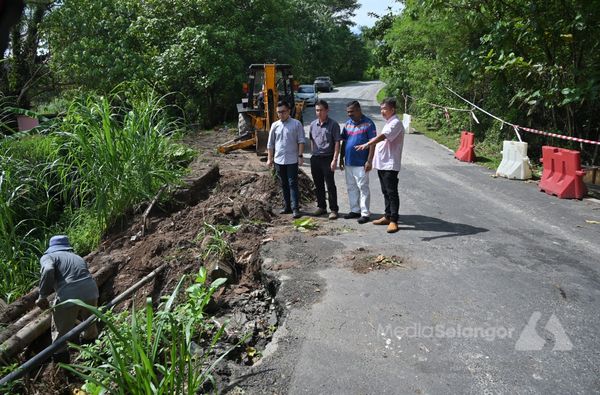 万挠奇谷路因发生罗里翻覆而破损后,获得万挠区州议员蔡伟杰拨款修复,工程从2025年4月7日起施工,预计在3天内竣工。(摄影:HARUN TAJUDIN / MEDIA SELANGOR)[/caption]
