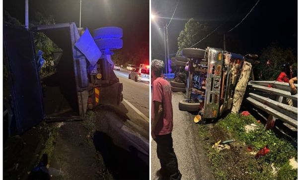 (浮罗山背13日讯)一辆载满沥青的罗里在山路拐弯处疑失控翻覆,44岁男司机受困车内伤势严峻,当场身亡。