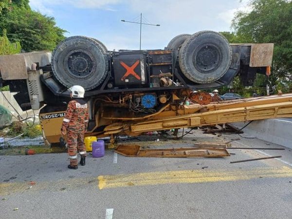 (乔治市16日讯)峇六拜的国中(SMK)一座建筑工地的起重机,今早疑打滑翻倒横躺路上,阻碍交通通行引发塞车。