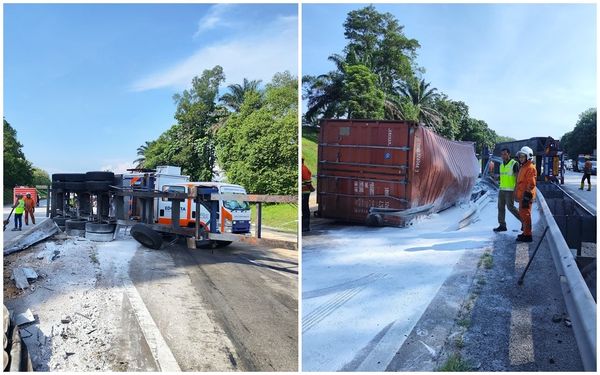 涉事的石灰货柜罗里于2025年5月20日在大道途中因轮胎爆裂失控,冲越大道分界堤后翻覆至南下方向的车道。(照片:PLUS脸书)[/caption]