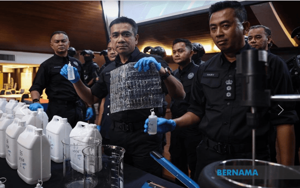 武吉阿曼肃毒局代总监莫哈末沙拉胡丁助理总监今日在记者会上指出,警方于本周三(29日)晚上10时30分展开突击行动,在现场查获20个5公升装的塑胶桶及6个0.5公升装的塑胶瓶,内装含有安非他命成分的电子烟油。