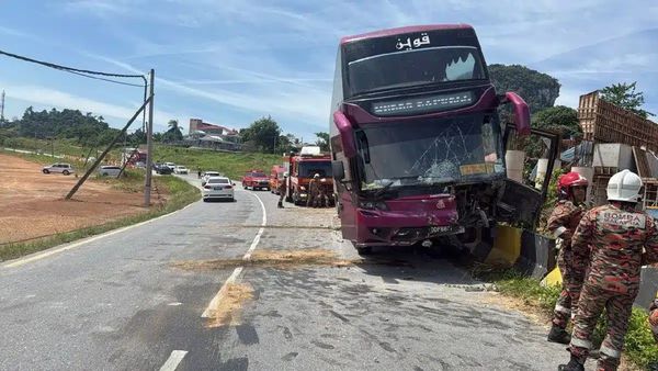 (话望生2日讯)一辆载着19名乘客的长途巴士从兰斗班让前往吉隆坡途中,疑似超速驾驶导致巴士失控撞上路边的护栏,所幸,所有乘客都没有大碍。