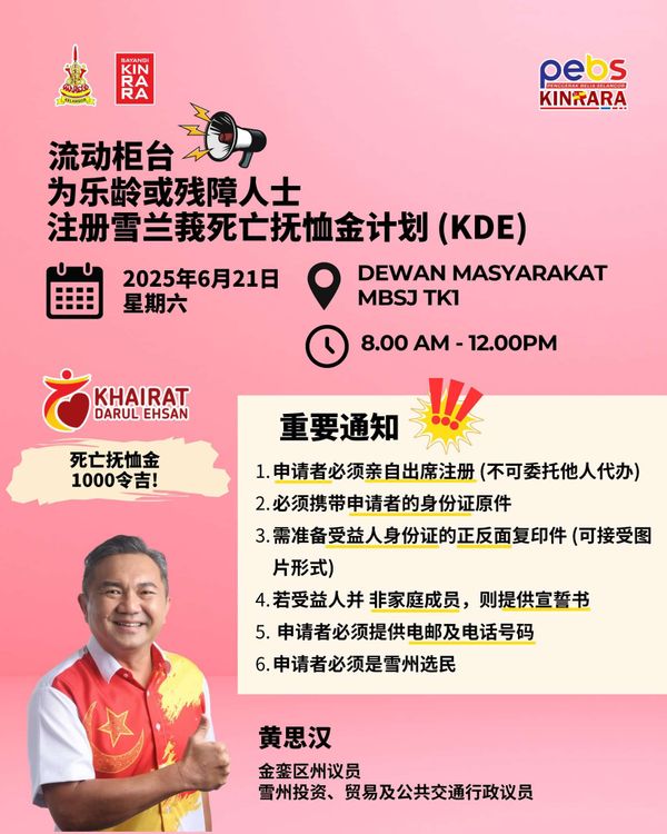 (莎阿南14日讯)还没申请“雪兰莪死亡抚恤金计划”(KDE)的蒲种人注意!金銮区州议员黄思汉将在本月21日(周六),设置流动柜台协助符合资格者办理注册程序,欲申请者切勿错失良机。