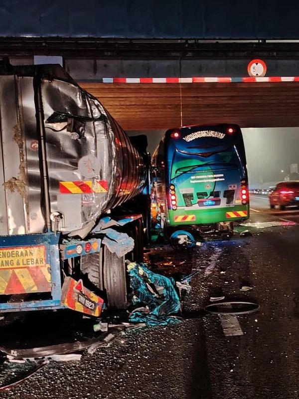 (峇株巴辖3日讯)一辆载有45名乘客的旅游巴士与两辆罗里相撞,造成2人死亡,另有16人受伤。