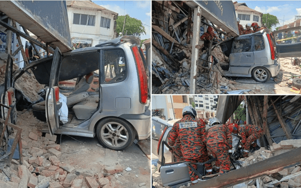 (北海16日讯—)77岁老翁驾驶的轿车今日下午在槟城北海旧码头路(Jalan Jetty Lama)失控,撞向一栋正在进行翻修工程的老建筑物。