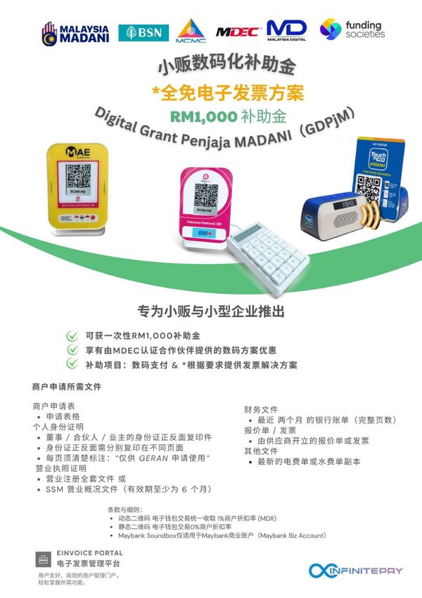 “符合资格者将获得付款提醒音响设施(Soudbox),并可支援一触即通(TNG)与两个银行线上付款系统,即MAE与RHB的二维码支付系统。”