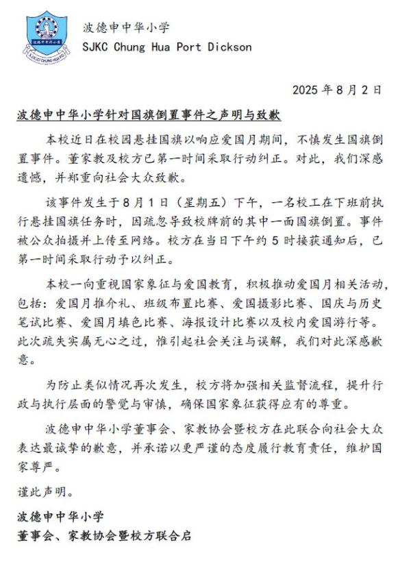 (芙蓉3日讯)波德申中华小学就周五疏忽倒挂国旗事件,公开道歉。