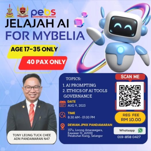 他今日在脸书发文指出,此项AI巡展兼培训课程仅限40名年龄介于17至35岁的青年参与,活动将于当天上午8时30分至下午1时,在巴生港口的班达马兰乡村发展与安全委员会礼堂(Dewan JPKK Pandamaran)举行。
