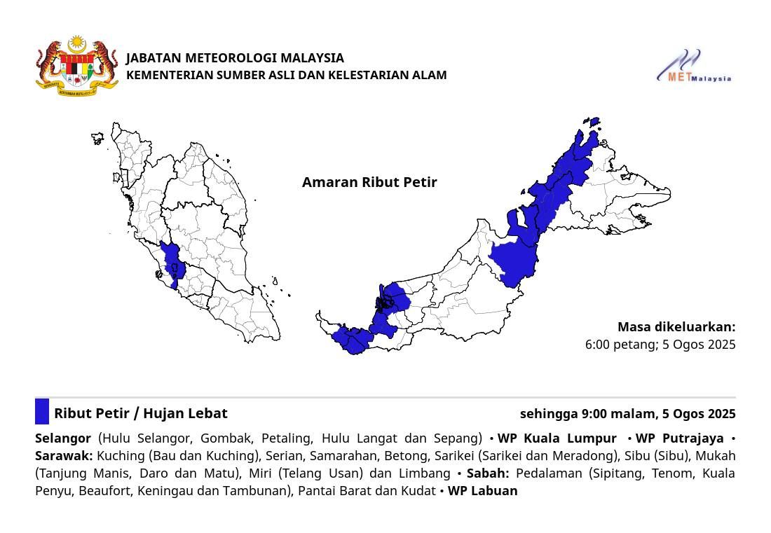 整个吉隆坡、布城和纳闽也预计面对同样恶劣的天气,至于砂拉越和沙巴则有局部地区预计有雷雨天气,直至今日晚上9时。