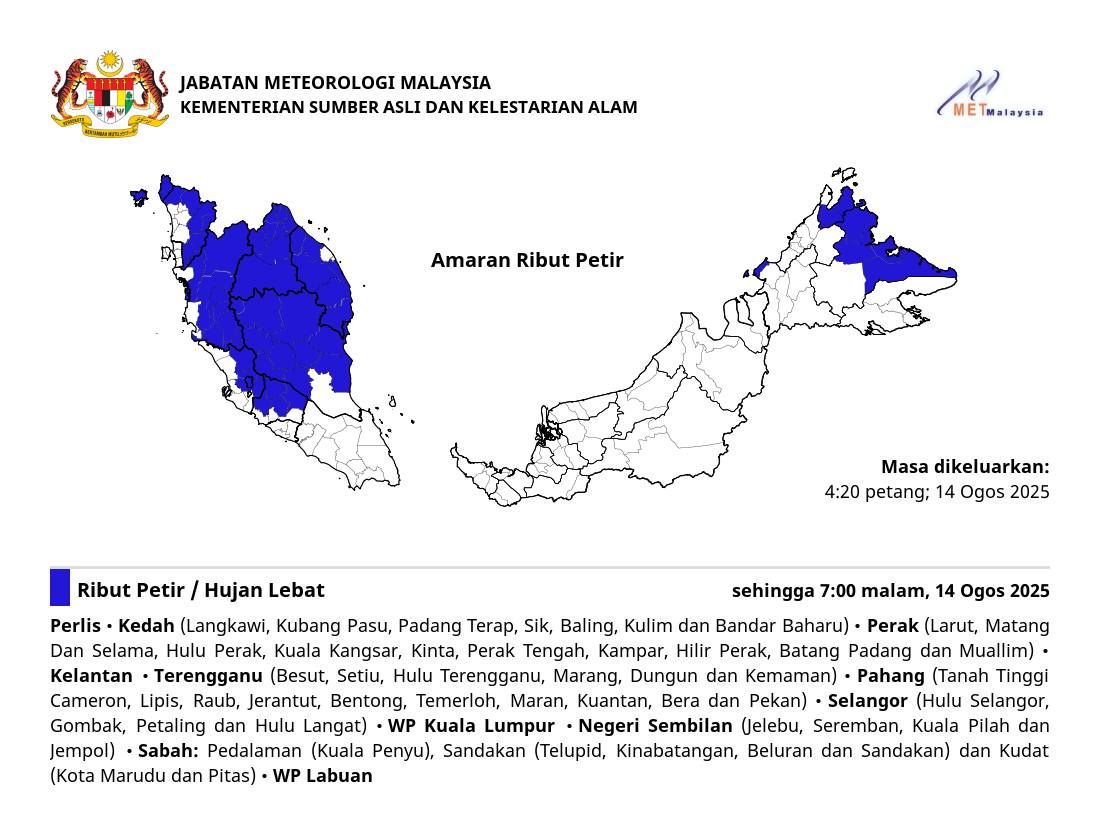 (莎阿南14日讯)轰隆隆!马来西亚半岛东海岸多个地区,包括雪兰莪局部地区预计迎来雷雨天气,直至今日晚上7时。