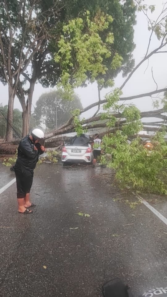 这起大树砸车事故周二下午发生在怡保–红土坎方向,靠近实兆远路段。