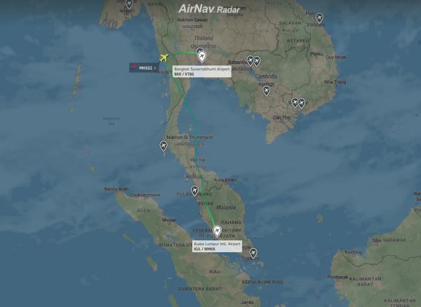 根据航空新闻网站 AIRLIVE.net 报道,MH102 航班于今日上午9时30分从吉隆坡起飞,并于上午11时45分改道安全降落在曼谷。