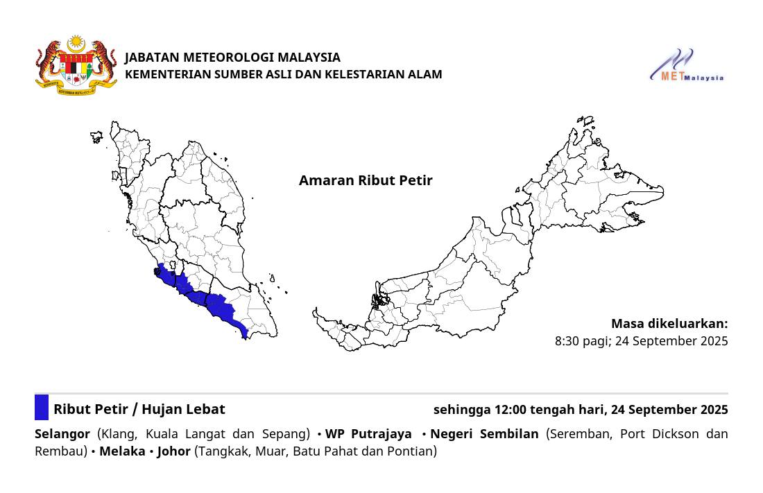 (莎阿南24日讯)雪兰莪州多个地区与布城,预计有雷暴雨至今日中午12时。