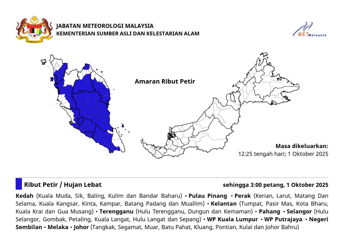 此外,吉打、霹雳、吉兰丹、登嘉楼和柔佛,则有局部地区预计迎来狂风暴雨,直至下午3时。