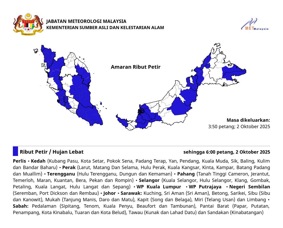(莎阿南2日讯)雪兰莪州8个地区、吉隆坡和布城预计有雷雨来袭,直至今日傍晚6时。