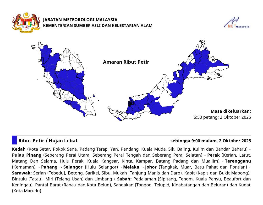 (莎阿南2日讯)整个彭亨和马六甲,以及雪兰莪乌鲁雪兰莪县,预计持续有雷暴警告至今日晚上9时。