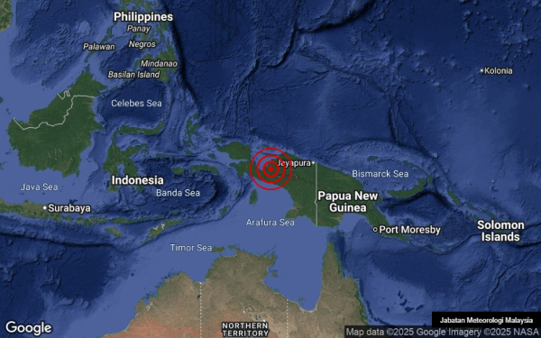 根据马来西亚气象局在脸书的贴文,地震震中位于南纬3.3度、东经136.3度,距离印尼查亚普拉(Jayapura)以西约500公里,震源深度为10公里。