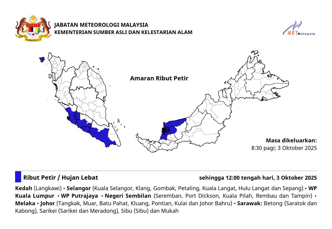 (莎阿南3日讯)雪兰莪州多个地区,以及整个吉隆坡与布城,预计有雷雨至中午12时,外出记得带伞。