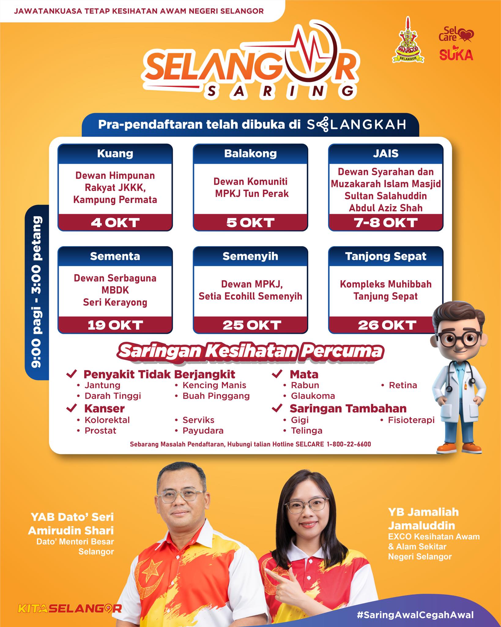 (莎阿南4日讯)雪兰莪州政府本月将举办7场全民体检活动(Selangor Saring),欢迎居民握机会接受免费体检,齐齐来为健康把脉!