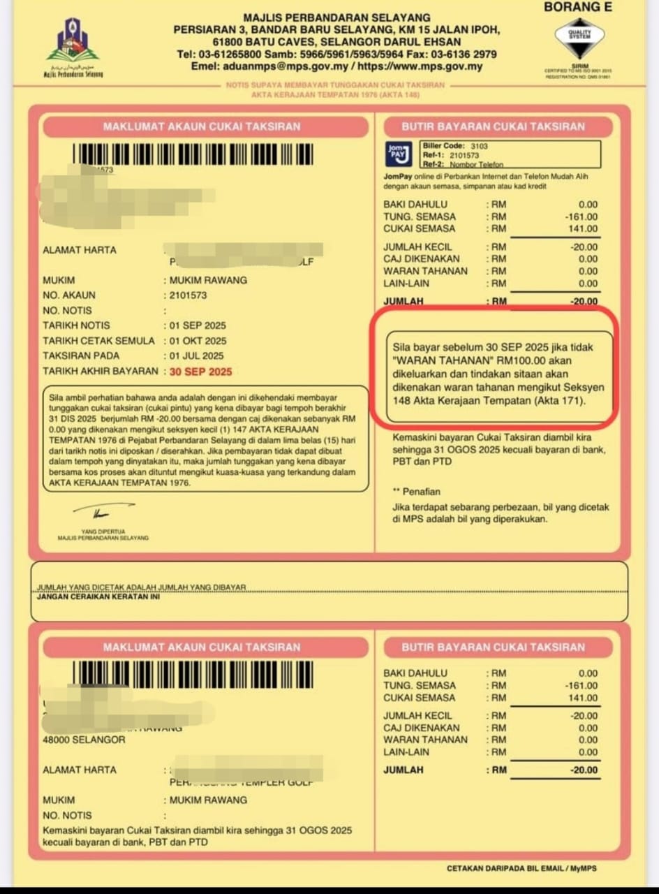 士拉央市议员余深恩指出,门牌税必须在 2月28日与8月31日前缴清,若接获扣押令(Waran Tahanan)需缴100令吉,若能在期限内结清则可豁免20令吉罚款。