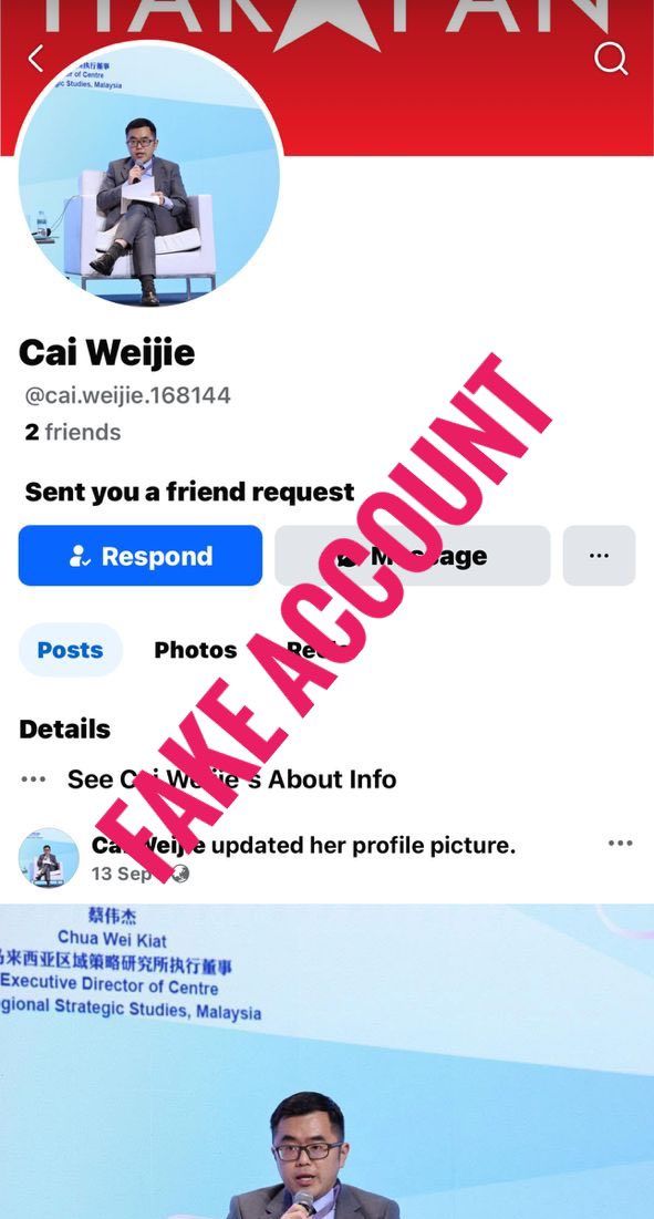 他在脸书发帖表示,自己遭人冒名开设'Cai Weijie '新脸书帐号,并澄清这不是其本人。