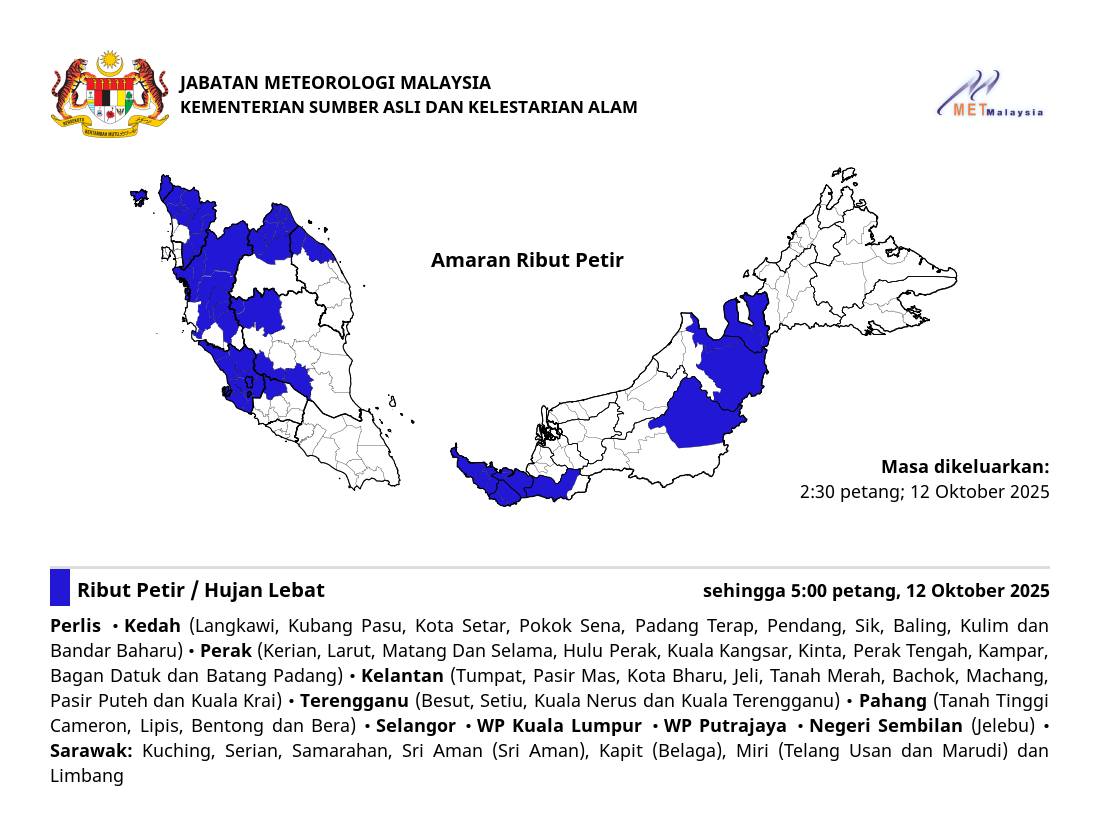 (莎阿南12日讯)整个雪兰莪、吉隆坡和布城预计雷雨交加,直至今日下午5时。