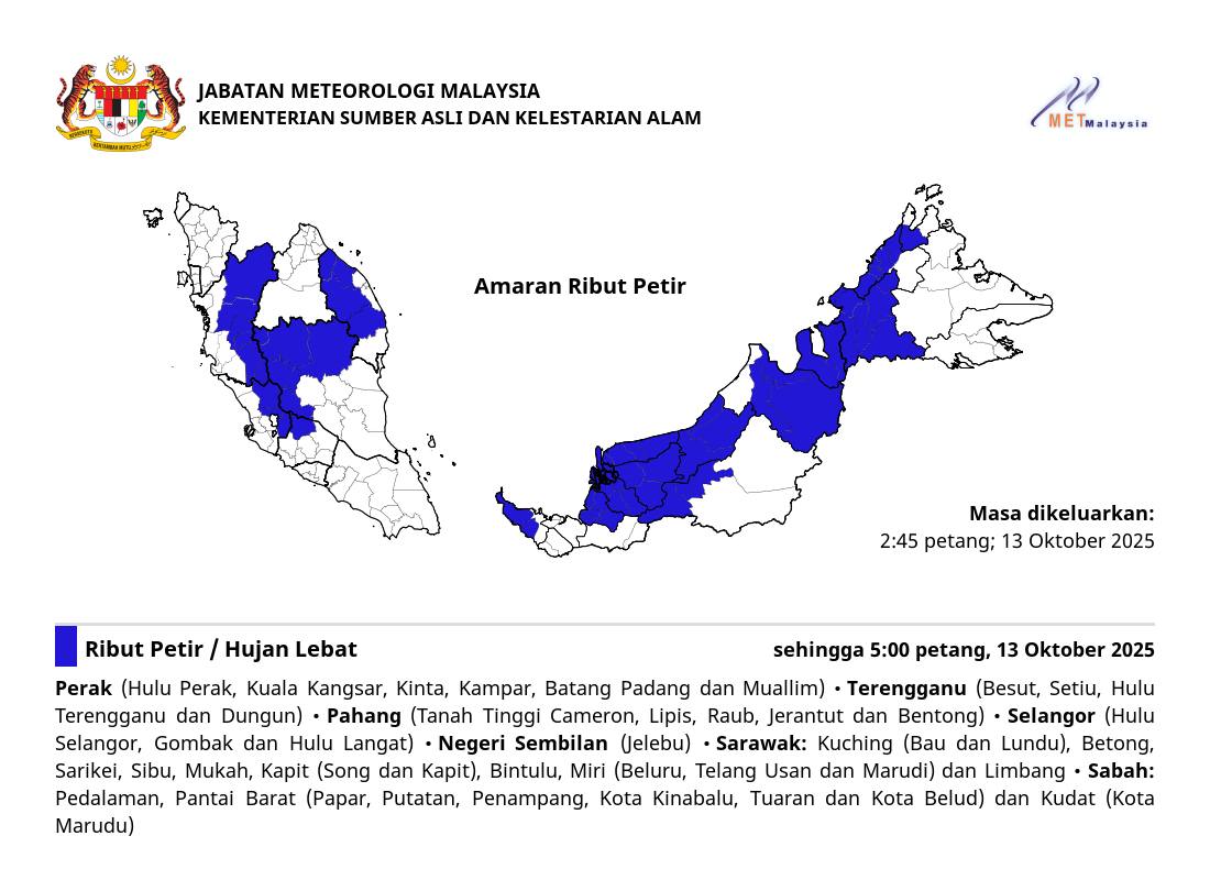 马来西亚气象局官方脸书于下午2时42分更新天气预告说,受影响的雪州地区有乌鲁雪兰莪、鹅唛和乌鲁冷岳。