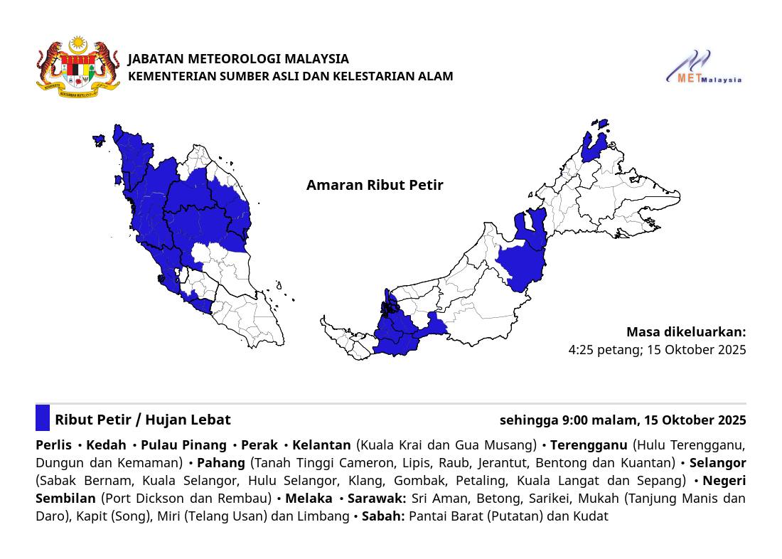 大马气象局今日下午4时28分于官方脸书更新天气预告时表示,受影响的雪州地区有沙白安南、瓜拉雪兰莪、乌鲁雪兰莪、巴生、鹅唛、八打灵、瓜拉冷岳和雪邦县。