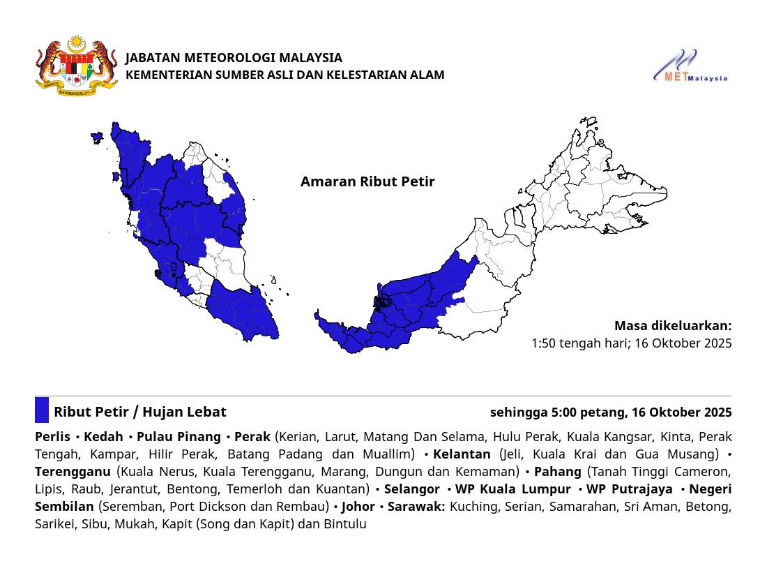 (莎阿南16日讯)轰隆隆!全国多个州属预计将迎来雷雨直至今日下午5时!