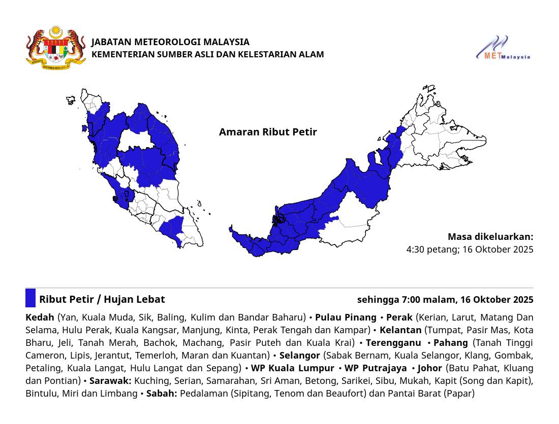 (莎阿南16日讯)雪兰莪州多个地区,以及整个吉隆坡和布城,预计有雷暴、强风和大雨出现,直至今晚7时。