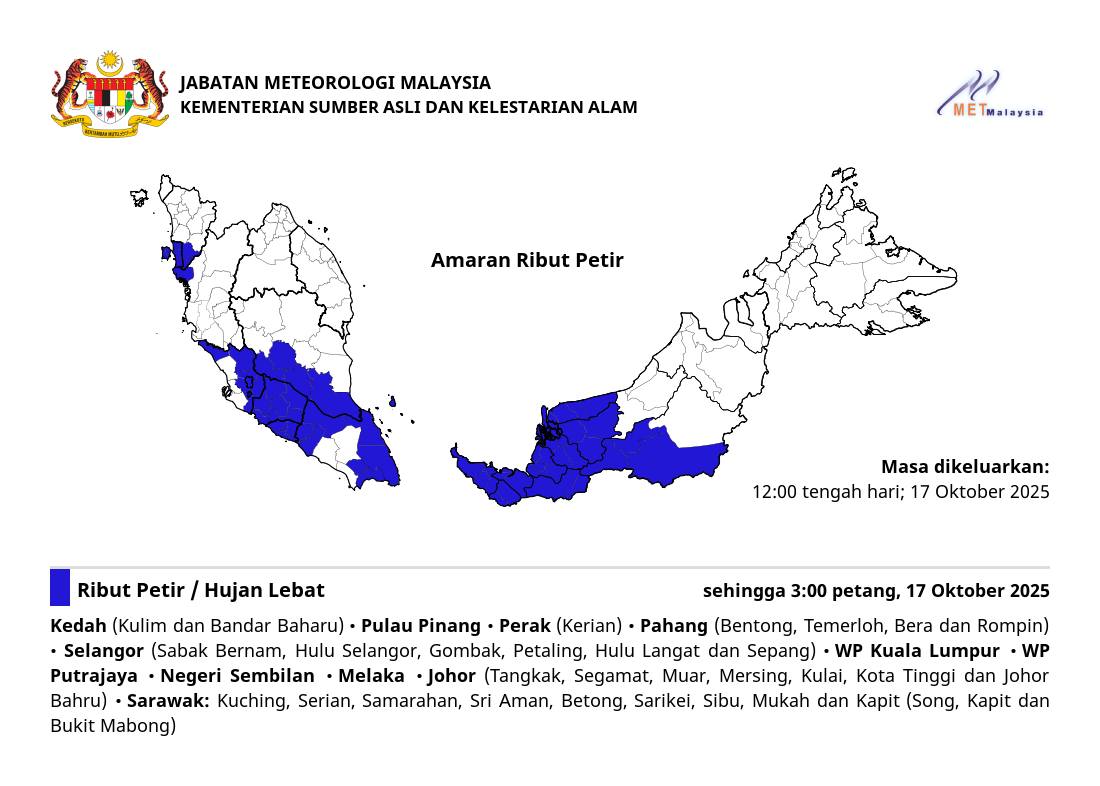 (莎阿南16日讯)大家注意咯,又是下雨的下午!全国多个州属预计将迎来雷雨直至今日下午3时!