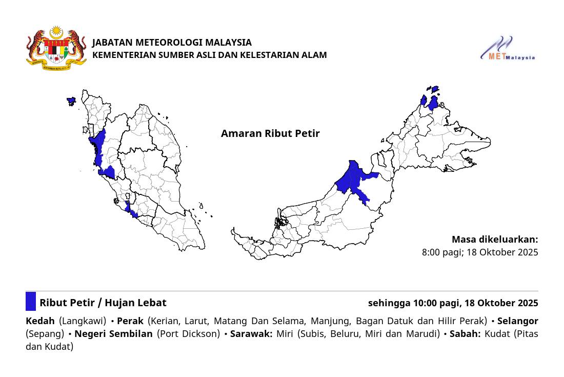 马来西亚气象局今日上午8时在官方脸书更新天气预告时表示,吉打、霹雳、森美兰、砂拉越和沙巴局部地区会受到恶劣的天气影响。