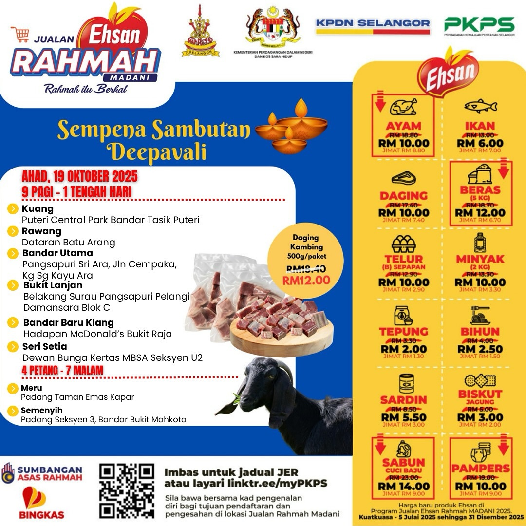 (莎阿南18日讯)益山慈悯市集明日(19日)将在雪兰莪州8个地点大促销,现场更配合屠妖节特增羊肉供民众采购,一包只售12令吉。