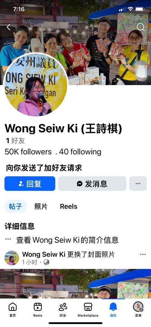 王诗棋于本月17日在脸书发帖称遭人假冒“Wang Shiqi”开设新脸书帐号,此次则是“Wong Seiw Ki(王诗棋)”