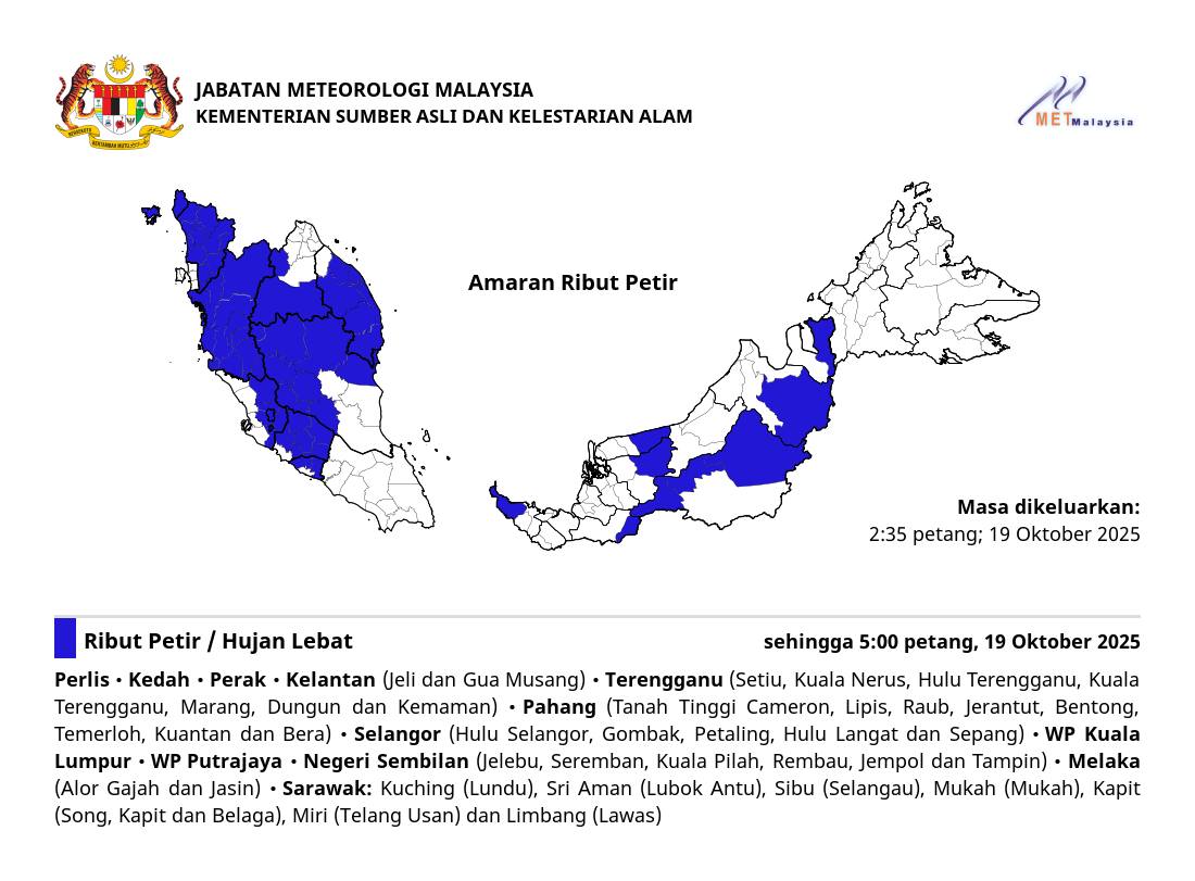 (莎阿南19日讯)雪兰莪州、吉隆坡与布城多个地区,预计有雷暴警告至今日下午5时。