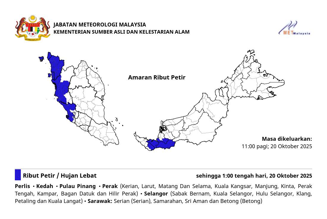 马来西亚气象局官方脸书于今日上午11时更新天气预告时表示,雪州受影响的地区有沙白安南、瓜拉雪兰莪、乌鲁雪兰莪、巴生、八打灵和瓜拉冷岳;整个玻璃市、吉打和槟城也预计遇上恶劣天气。
