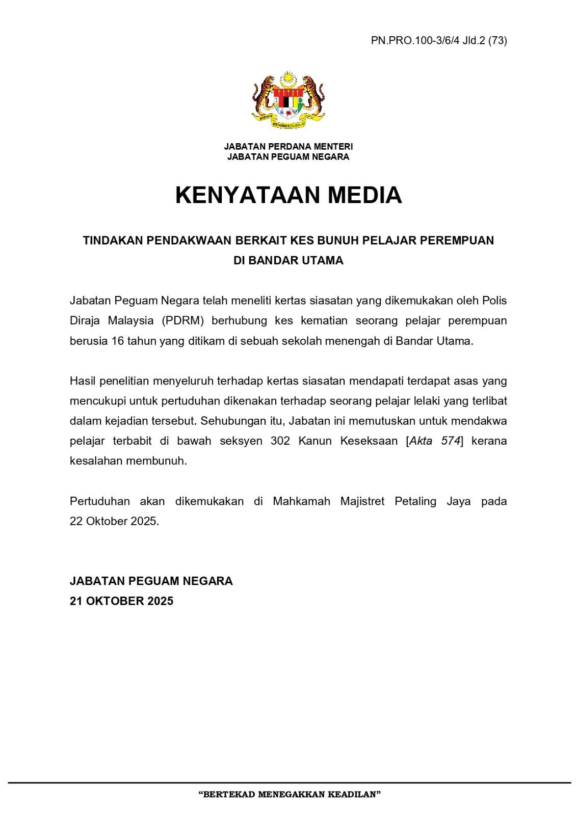 “因此,总检察署决定援引刑事法典第302条文(谋杀),于2025年10月22日在八打灵再也推事庭提控涉案少年。”