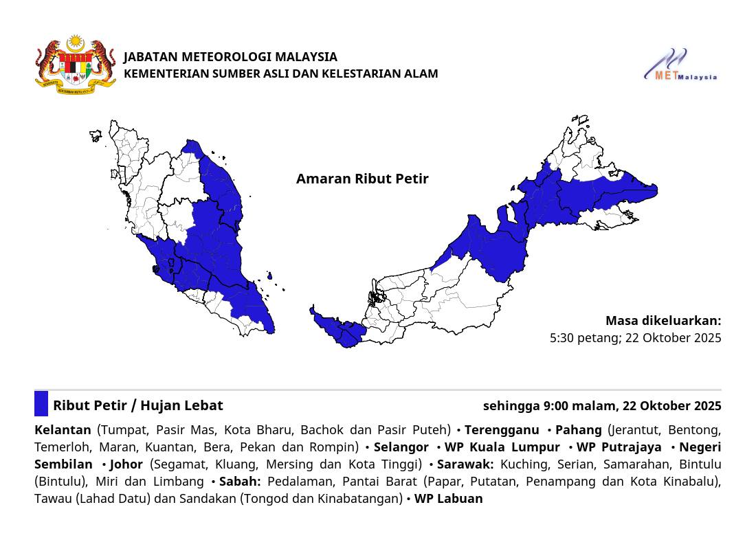 (莎阿南22日讯)全马大部分州属与直辖区预计持续迎来狂风暴雨,直至今日晚上9时。