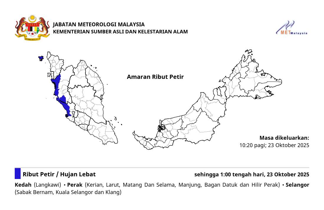 (莎阿南23日讯)雪兰莪州数个地区预计有雷雨直至今日下午1时,各位记得带伞出门和小心开车。