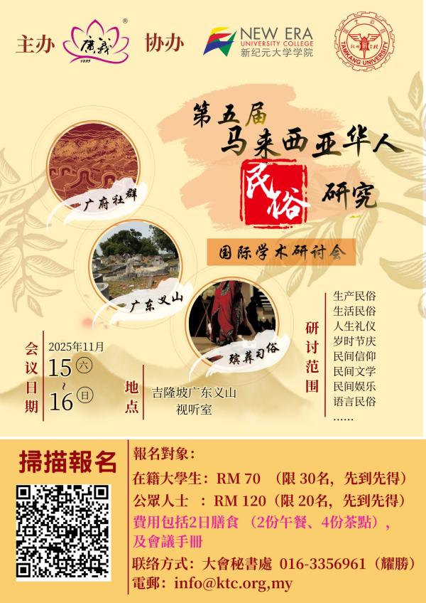 来自马来西亚、台湾及东南亚地区的多位著名学者将发表专题论文与主题演讲,包括江柏炜教授《东南亚华人义山研究的回顾与前瞻》、阮涌和研究员《吉隆坡广东义山创立前史(1881–1895)》、郭宗华助理教授《吉隆坡广东义山于迁山事件后社会功能的变革》、林美容教授《坐椅往生的宗教与民俗意涵》及李永球先生《从破地狱浅探儒释道的灵魂救赎仪式》等,议题兼具学术深度与文化价值。
