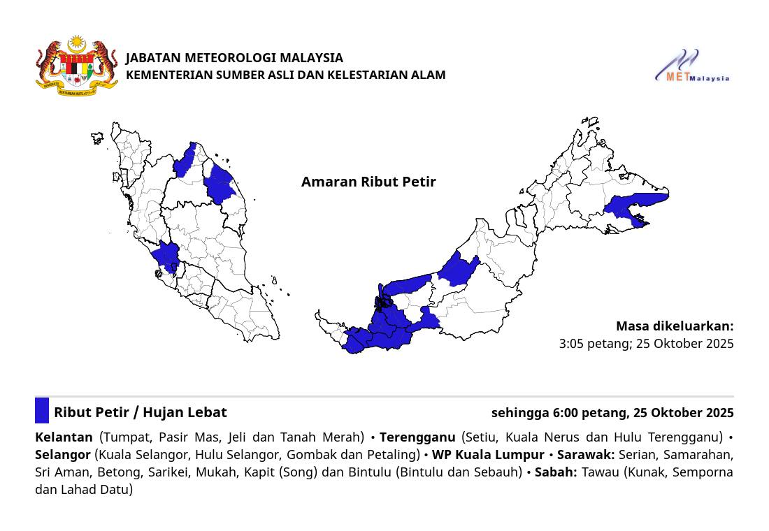 (莎阿南25日讯)雪兰莪州多个地区与吉隆坡,预计有雷暴、强风和大雨来袭,直至今日傍晚6时。