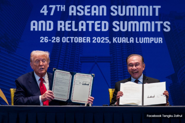 (吉隆坡27日讯)马来西亚首相拿督斯里安华与美国总统特朗普于10月26日在签署互惠贸易协定时的一段轻松互动,为这个正式场合增添倍感亲切的氛围。