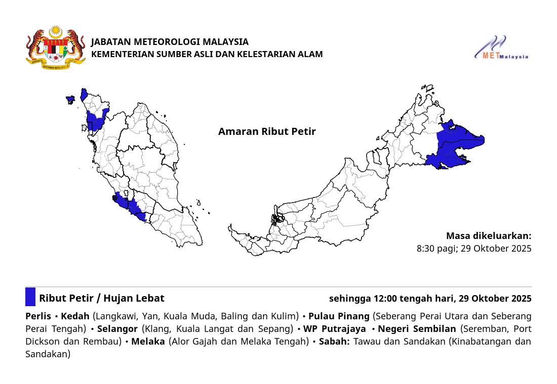 (莎阿南29日讯)雪兰莪州3个县区和布城预计有雷雨来袭,直至今日中午12时。