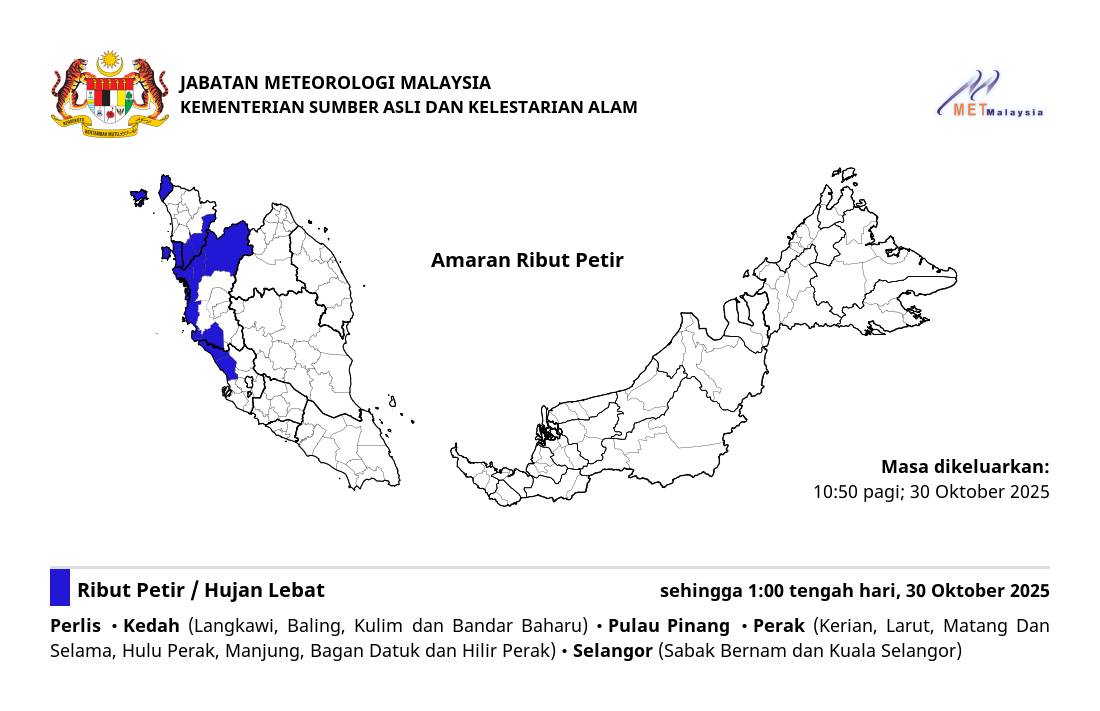 马来西亚气象局于今日上午10时50分在官方脸书更新天气预告时表示,除了雪州两个北部县区受影响外,整个玻璃市和槟城也预计面对恶劣天气。