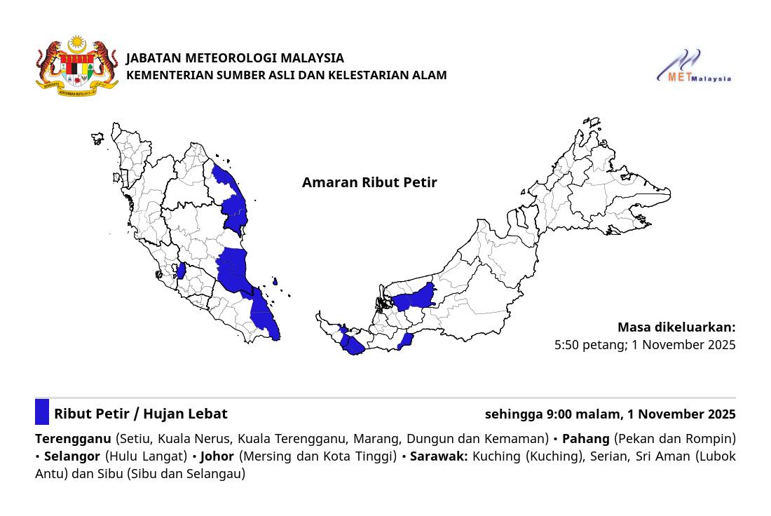 大马气象局于今日下午5时50分在官方脸书更新天气预告时表示,雪州受影响的地区为乌鲁冷岳,登嘉楼、彭亨、柔佛和东马砂拉越,则是预计有雷雨天气,直至今日晚上9时。