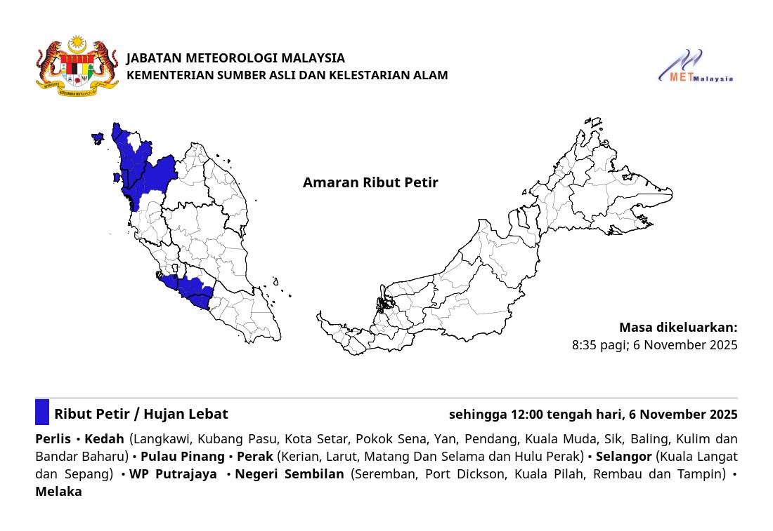 同时,雷暴警告也出现在整个玻璃市、槟城和马六甲,至于吉打、霹雳和森美兰,只是局部有雨。