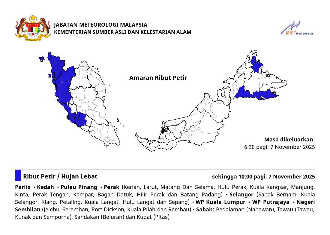 马来西亚气象局今日清晨6时30分在官方脸书更新天气预告时表示,雪州受影响的地区有沙白安南、瓜拉雪兰莪、巴生、八打灵、瓜拉冷岳、乌鲁冷岳和雪邦。