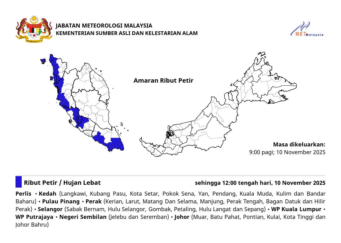 马来西亚气象局于今日上午9时在官方脸书更新天气预告时表示,雪州受影响的地区有沙白安南、乌鲁雪兰莪、鹅唛、八打灵、乌鲁冷岳和雪邦;整个玻璃市、槟城、吉隆坡和布城也预计出现恶劣天气。