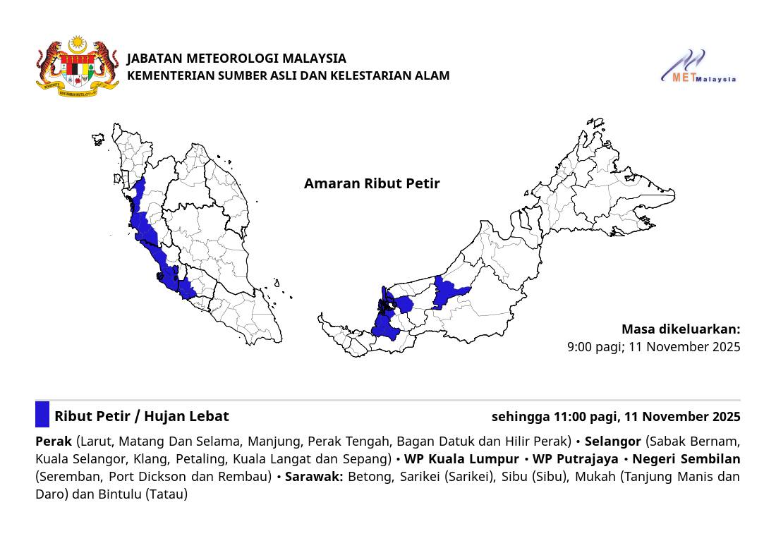 霹雳、森美兰和东马砂拉越则是局部地区预计有雷雨来袭,直至今日上午11时。