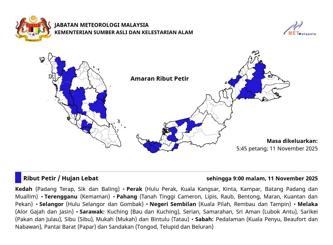 马来西亚气象局于今日下午5时45分在官方脸书更新天气预告时表示,吉打、霹雳、登嘉楼、彭亨、森美兰、马六甲和东马沙巴与砂拉越的局部地区预计也有雷雨来袭,直至今日晚上9时。